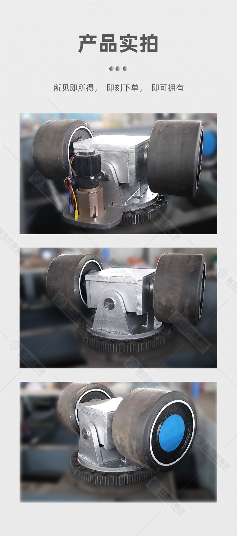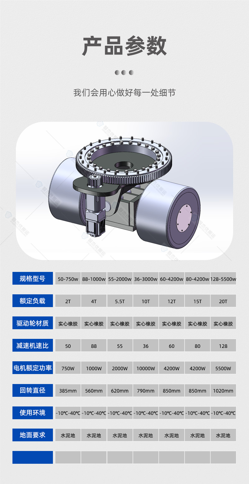 描   述: AGV旋轉舵輪,直徑508mm,負載10噸,實心橡膠輪胎,電機3.3kw,速比64,回轉直徑1.295米;