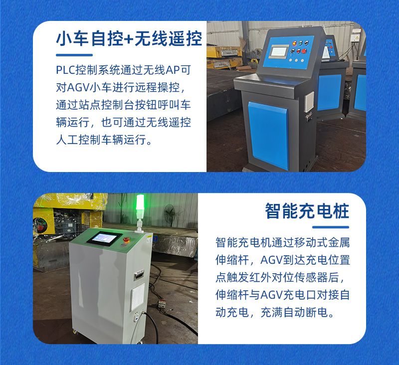 PLC控制系統(tǒng)通過無線AP可對AGV小車進行遠程操控,通過站點控制臺按鈕呼叫車輛運行,鋰電池供電滿載運行時間不低于2小時,配備自動充電樁,按照程序設(shè)定低于電量設(shè)定值后自行前往充電樁自動充電,支持2小時快充充滿自動斷電。輪系配備臥式驅(qū)動輪搭配萬向輪可全向運行。伺服電機伺服行星減速機***控制車輪轉(zhuǎn)向,實現(xiàn)前進后退 左轉(zhuǎn)右轉(zhuǎn) 縱橫移動 原地旋轉(zhuǎn)等運動控制,差速轉(zhuǎn)向的轉(zhuǎn)彎方式噪音小不易損傷地面,安全裝置配置雷達檢測自動避障,聲光報警、急停開關(guān),車體四周機械防撞,安全性直接拉滿,確保AGV小車平穩(wěn)安全運輸作業(yè)。