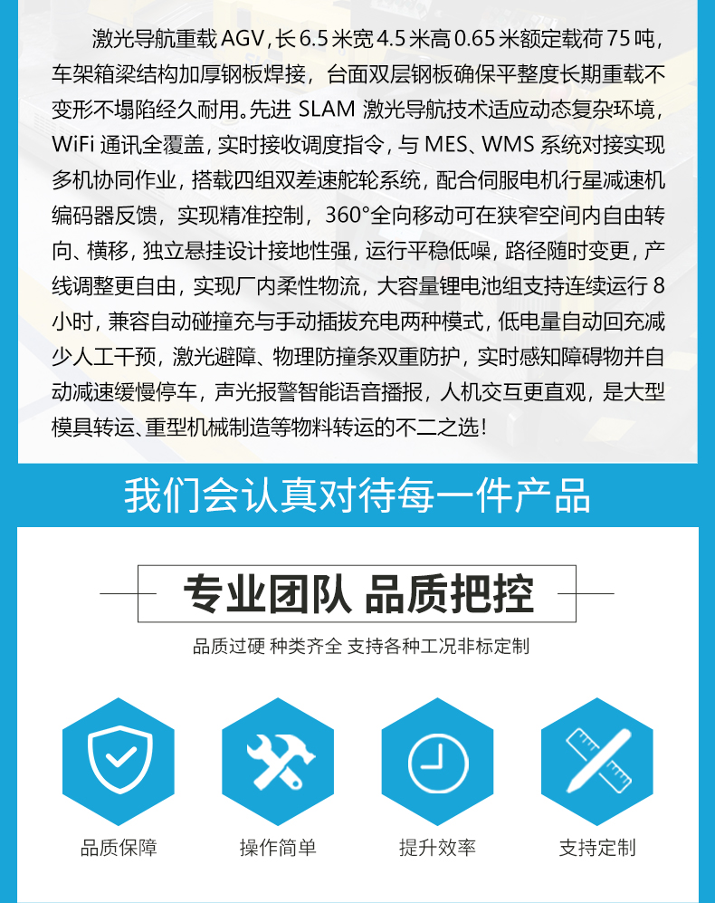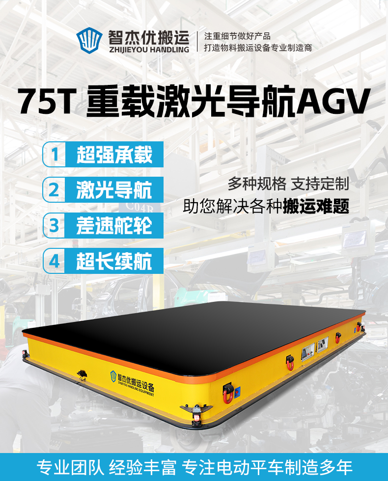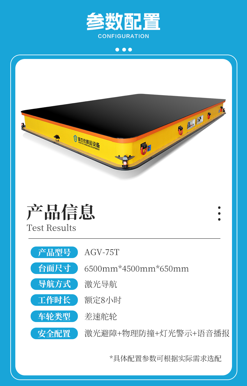描   述: 75噸級重載AGV,卓越性能、強大承載,差速舵輪精密驅動,360°全向移動,***slam激光導航等諸多功能加持,WiFi通訊、雙重防護體系,助力車間物料實現柔性化轉運!