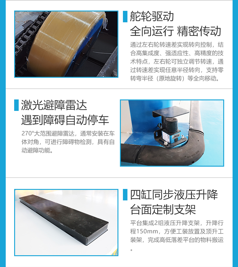 熱線:15517329551 專為涂裝線工件運輸定制的20噸重載AGV,采用磁條導航,按照預設路徑自動循跡行走,設有4個站點自動識別***???,高配HMI人機交互大屏,手自動模式一鍵切換,輪組配備臥式舵輪,伺服電機+行星減速機傳動精密高效,可實現橫移、斜行、原地旋轉等全向移動,優化運行路徑減少等待時間,臺面設置兩組液壓升降支架150mm行程方便工件裝卸,鋰電池供電抽拉式電池箱,一主一備快速更換,全天8小時連續作業不停機,對角雷達避障、四周觸邊防撞、聲光報警、急停按鈕全方位守護運行安全!