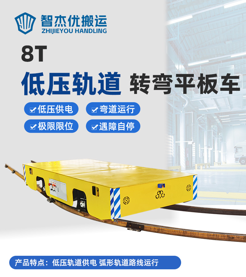智杰優搬運為鋼材加工行業定制的低壓軌道供電平板轉運車,主要用于車間內生產線鋼材的轉運,冶金行業半成品和成品的運輸以及周轉,額定載荷8噸,采用低壓軌道供電方式,結合現場作業需求運行于弧形軌道上,行走輪經絕緣處理,配備導向輪控制車輛轉彎,轉彎半徑4.5米,可搭載物料平穩運行,安全往返運輸,兩端設有極限限位開關,防止小車沖出軌道,光電檢測自動避障,急停開關應對突發情況,降低作業風險,提升生產靈活性。