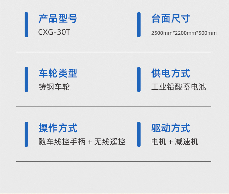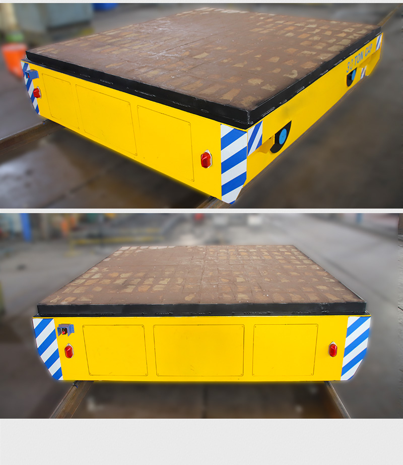 描   述: 這是一臺山東客戶定制的蓄電池軌道電動平車,該車長2.5米,寬2.2米,高0.5米,車架箱型梁焊接,結構牢固,載重量大,可載重30噸,應客戶使用要求,臺面鋪設耐火磚;平車采用蓄電池供電,運行距離不受限制,遙控器一鍵操作,可啟動停止、前進后退、調速等,設有雙限位開關,可根據現場設定地點自動???,前后光電檢測,遇障自停,聲光報警保障安全,能夠在垂直軌道、L型軌道、S型軌道、弧形軌道及易爆、擺渡場合使用。