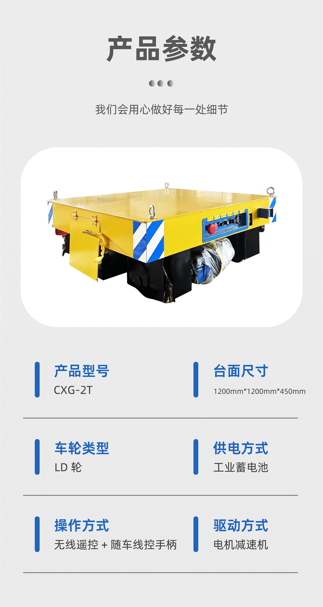 這是一臺小型軌道搬運車載重試機現場,整車長1.2米寬1.2米高0.45米載重2噸,箱梁結構穩定牢固,不易變形;無線遙控平車前進后退,采用鑄鋼車輪,硬度高耐磨損承重力強,電機減速機驅動平車進行搬運作業,限位開關可實現平車定點停靠作業,前后配備光電檢測遇障自停,聲光報警保障安全,該系列電動平車還可進行功能升級、升降臺面、弧形軌道運行等。