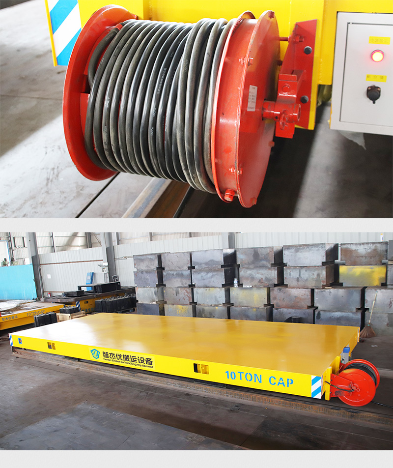 熱線:15517329551 電纜卷筒軌道電動平車,整車長6米寬2.5米高0.5米,車架箱梁結構承重力強可搬運10噸的貨物,380V電纜供電,設有卷筒裝置自動收放電纜線,可滿足全天候的作業需求,平車運行距離20米,運行速度0-20m/min,支持變頻調速,無線遙控和有線手柄兩種操控方式,操作簡單方便快捷,是車間短距離物料轉運的專業選手。