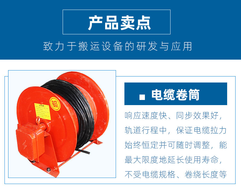 描   述: 卷筒式電纜供電軌道平車搬運車 載重10噸,電源通過電氣控制系統,給直流牽引電機提供電力。使平車啟動、停止、前進、后退、調速等。
