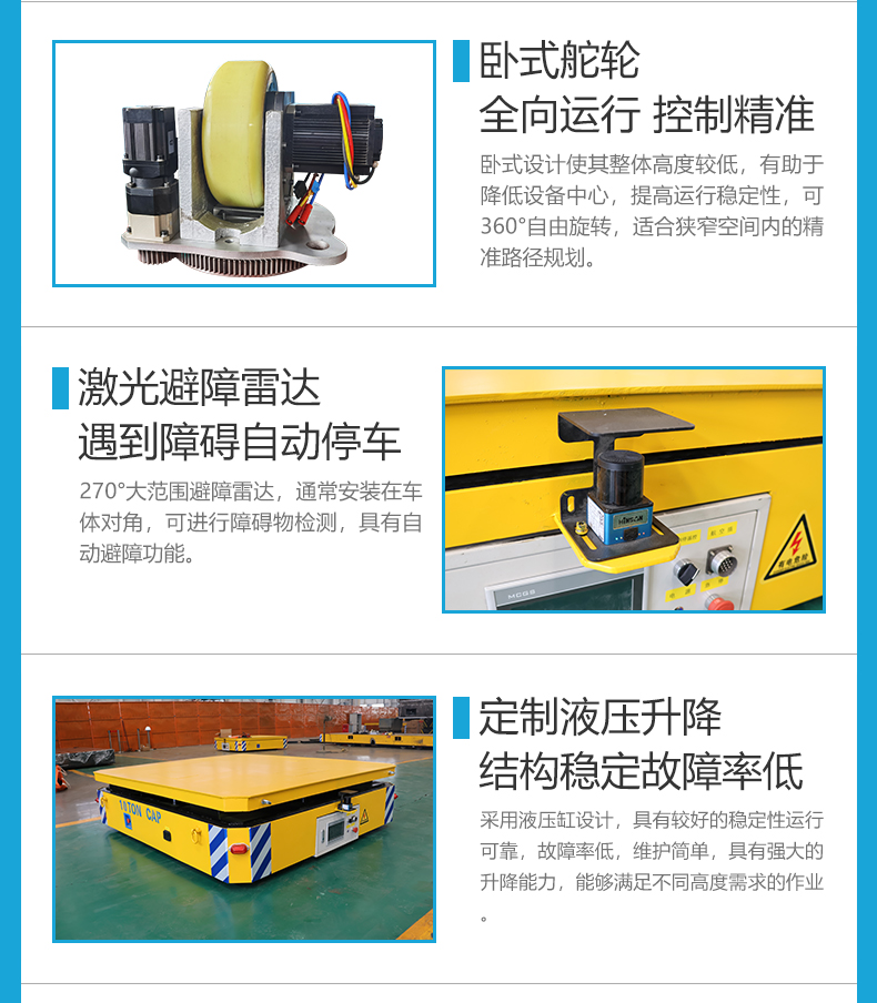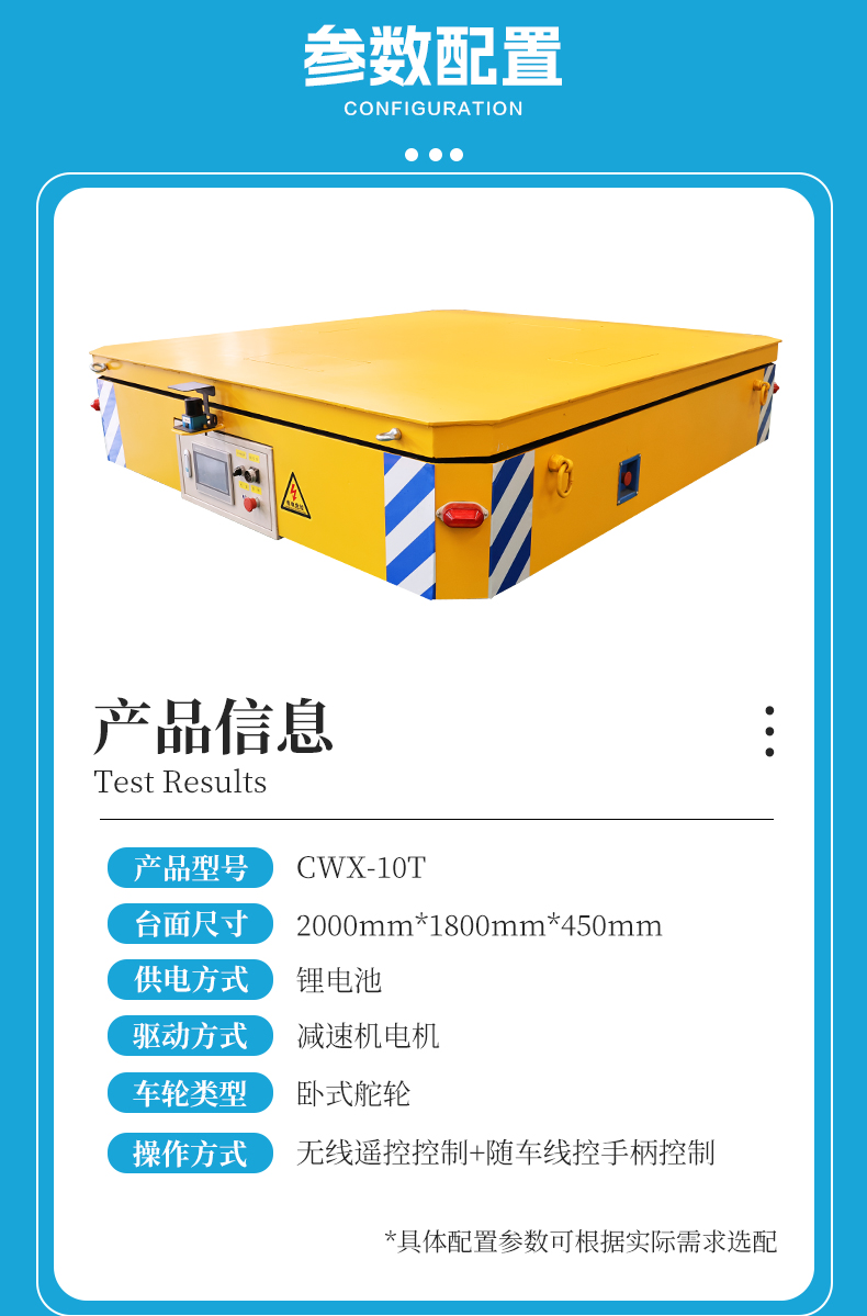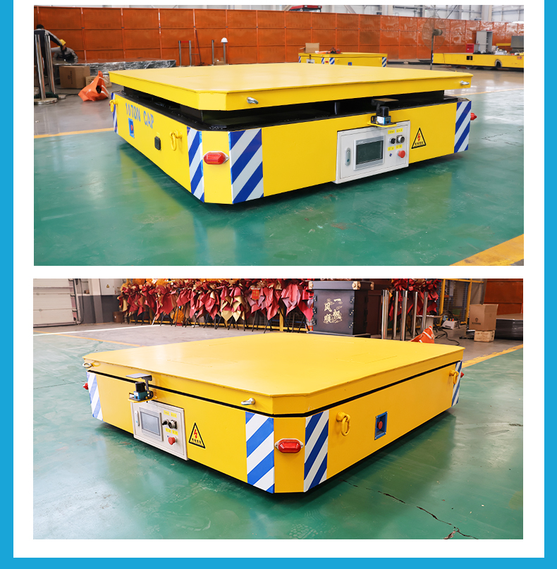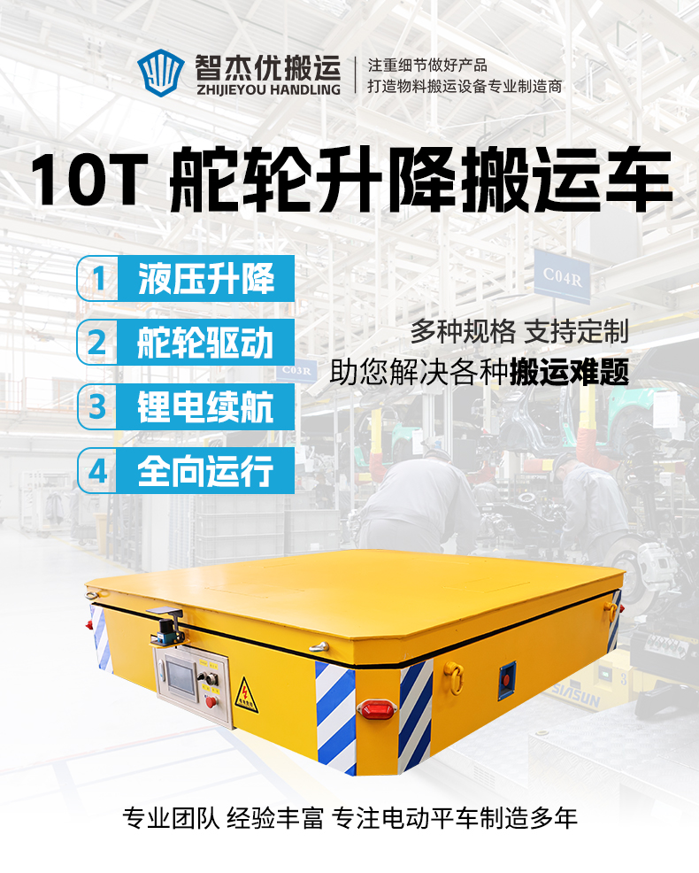 描   述: 舵輪升降搬運(yùn)車,以2米*1.8米緊湊車身,10噸級強(qiáng)悍載重、360度全向靈活操控及智能升降功能,為狹窄工況重型機(jī)械轉(zhuǎn)運(yùn)場景提供一站式解決方案。搭載臥式舵輪驅(qū)動系統(tǒng),支持原地0轉(zhuǎn)彎半徑旋轉(zhuǎn),狹窄通道自由穿梭,平臺定制升降行程55mm,可快速潛入工裝架底部完成頂升托舉,一鍵操控平穩(wěn)升降,高性能鋰電池組供電,滿載10噸連續(xù)作業(yè)時(shí)間不低于3小時(shí),無懼高強(qiáng)度作業(yè)需求,告別傳統(tǒng)燃油設(shè)備噪音與污染,綠色節(jié)能!