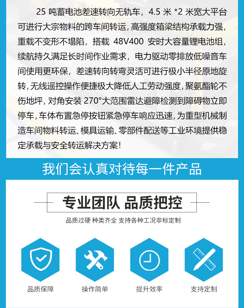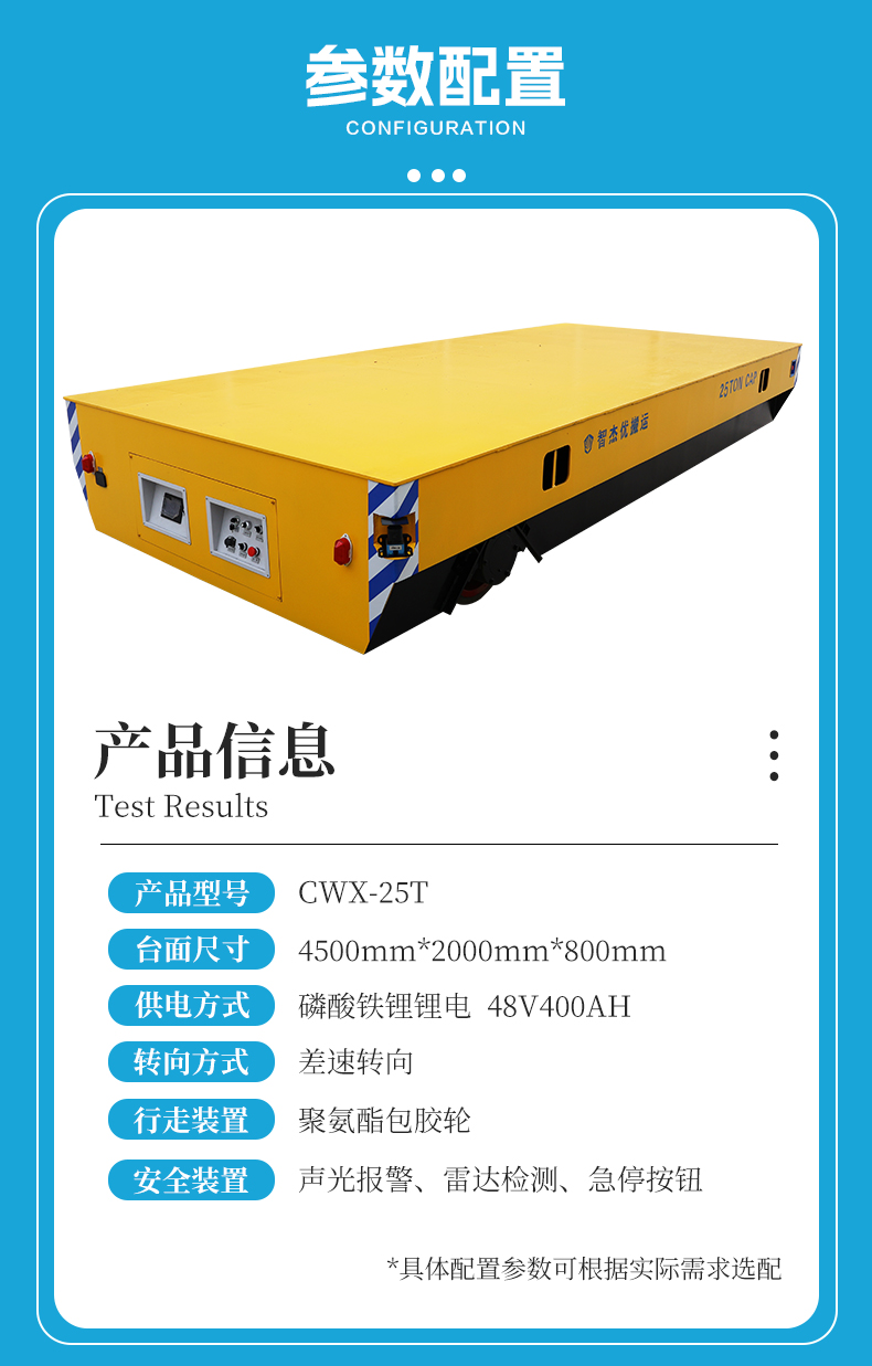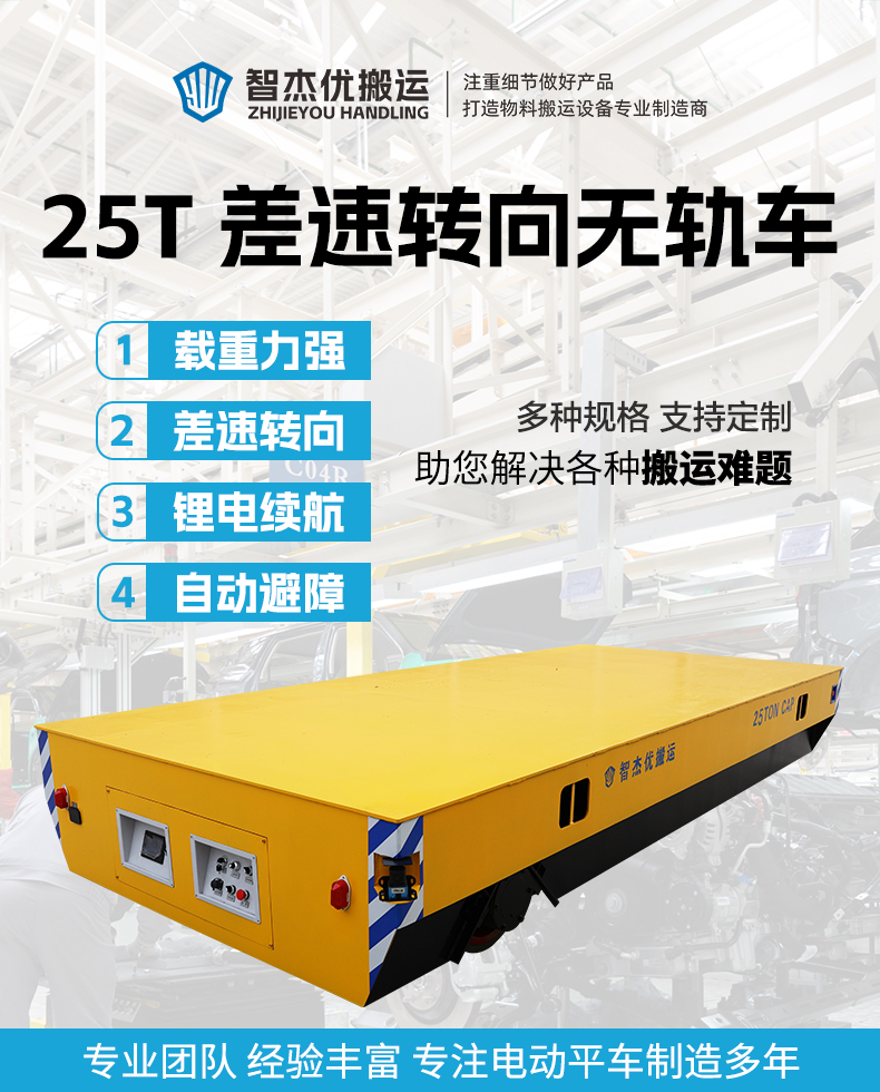 描   述: 25噸蓄電池差速轉(zhuǎn)向無軌轉(zhuǎn)運(yùn)車,搭載48V400安時(shí)大容量鋰電池組,續(xù)航持久滿足長時(shí)間作業(yè)需求,差速轉(zhuǎn)向轉(zhuǎn)彎靈活可進(jìn)行極小半徑原地旋轉(zhuǎn),對(duì)角安裝270°大范圍雷達(dá)避障檢測(cè)到障礙物立即停車,為重型機(jī)械制造車間物料轉(zhuǎn)運(yùn)、模具運(yùn)輸、零部件配送等工業(yè)環(huán)境提供穩(wěn)定承載與安全轉(zhuǎn)運(yùn)解決方案!