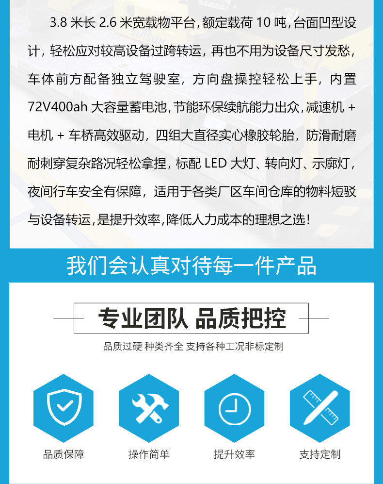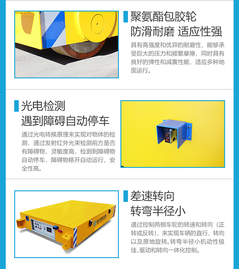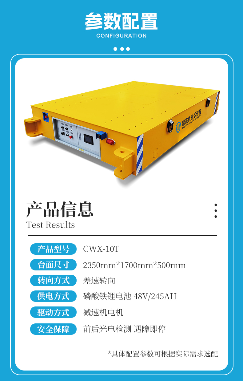 描   述: 長2.4米寬1.7米額定載荷10噸,0.5米低重心設(shè)計方便物料上下裝卸,滿載運行平穩(wěn)轉(zhuǎn)向靈活流暢,無線遙控操作便捷指令接受響應(yīng)迅速,大扭矩減速機電機驅(qū)動力足爬坡輕松不費力,差速轉(zhuǎn)向轉(zhuǎn)彎半徑小狹窄通道靈活騰挪,光電檢測遇到障礙自動停車,適用于大型設(shè)備、模具、原材料等進(jìn)行車間工序間的過跨轉(zhuǎn)運!