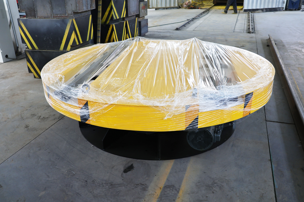 針對冶金車間空間緊湊、軌道縱橫交錯的復雜布局,我們在路線交叉口配置了2套電動轉(zhuǎn)盤,轉(zhuǎn)盤支持360°自由旋轉(zhuǎn),協(xié)助轉(zhuǎn)運車在路口自動切換軌道、調(diào)整運行方向。這一設計破解了軌道車運行方向的局限,讓車間工藝布局變得靈活可變,為全流程鐵水轉(zhuǎn)運提供順暢路線。