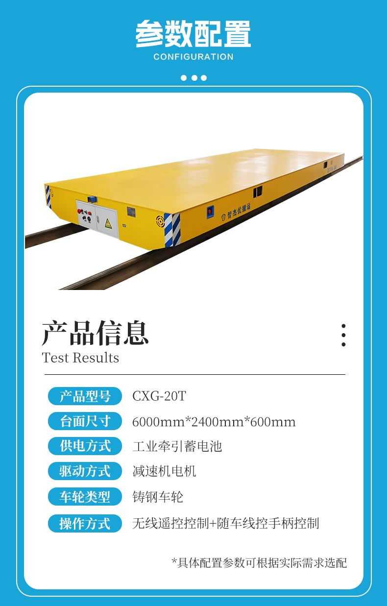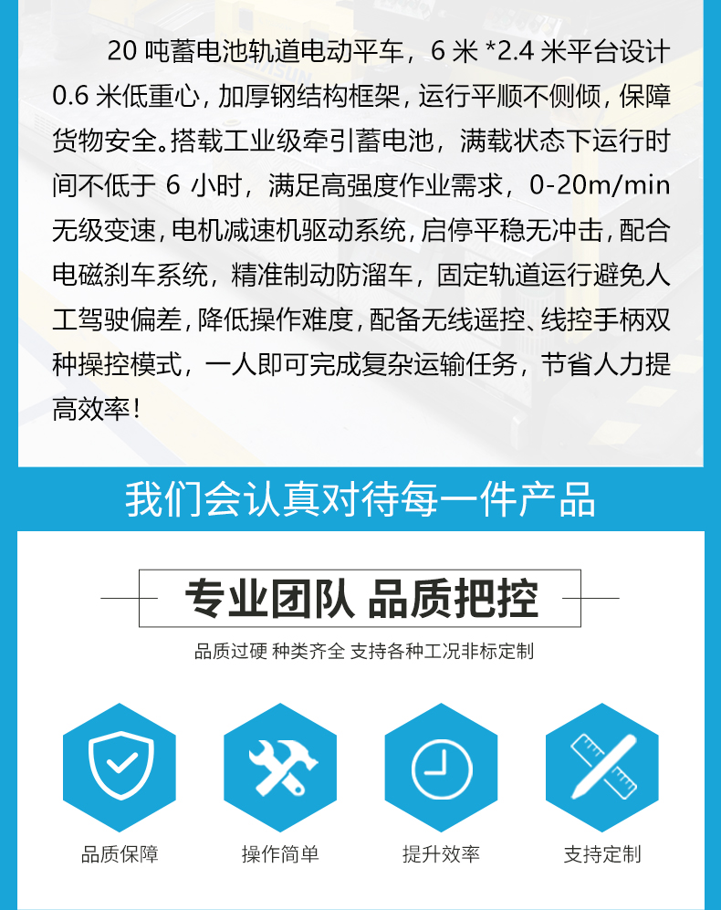 描   述: 20噸蓄電池軌道電動平車,6米*2.4米平臺設(shè)計 0.6米低重心,加厚鋼結(jié)構(gòu)框架,運行平順不側(cè)傾,保障貨物安全。搭載工業(yè)級牽引蓄電池,滿載狀態(tài)下運行時間不低于6小時,滿足高強度作業(yè)需求,0-20m/min無級變速,電機減速機驅(qū)動系統(tǒng),啟停平穩(wěn)無沖擊,配合電磁剎車系統(tǒng),***制動防溜車,固定軌道運行避免人工駕駛偏差,降低操作難度,配備無線遙控、線控手柄雙種操控模式,一人即可完成復(fù)雜運輸任務(wù)。