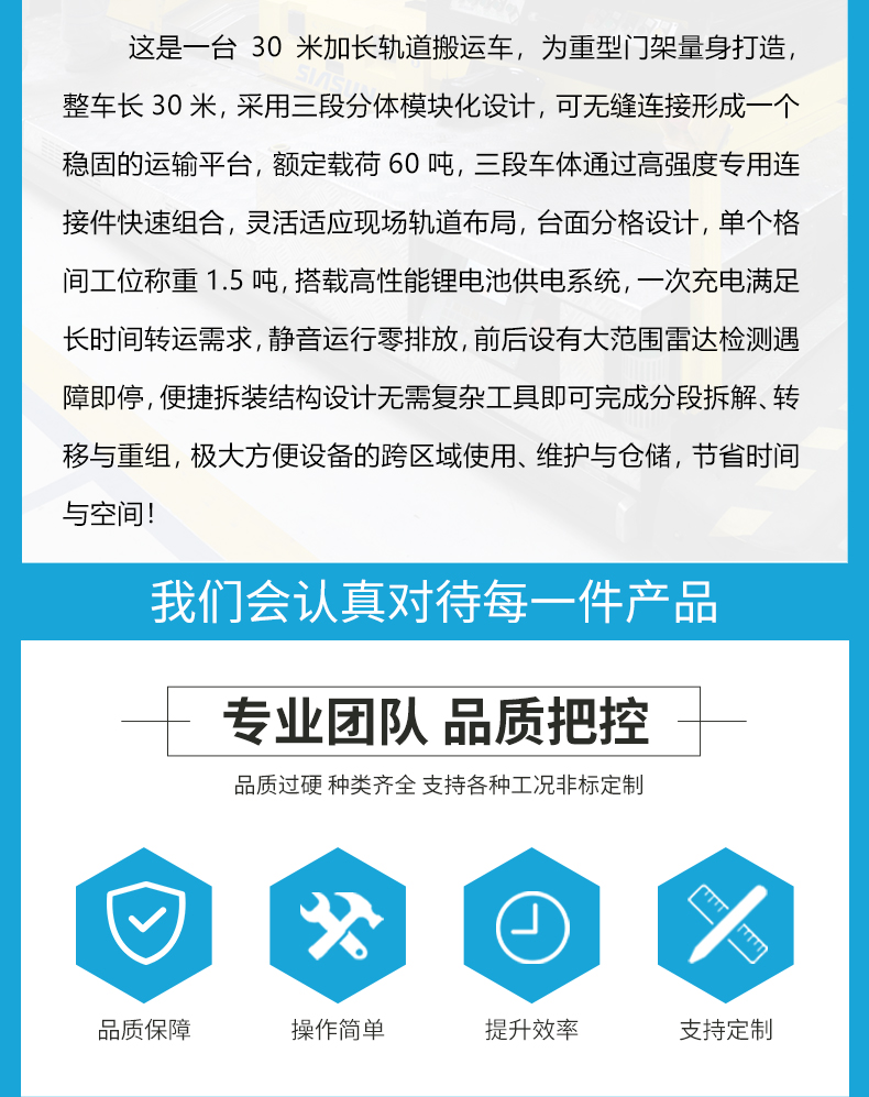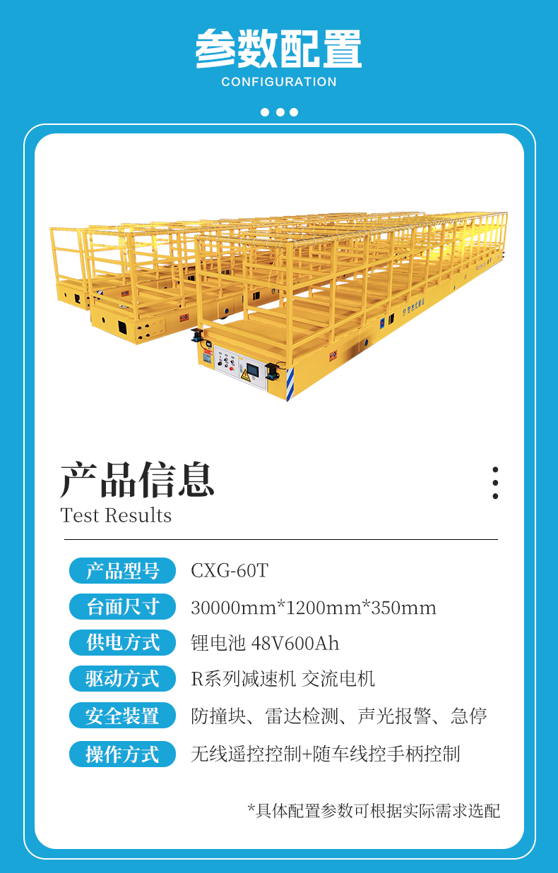描   述: 為重型門架量身打造,整車長30米,采用三段模塊化設計,可無縫連接形成一個穩固的運輸平臺,額定載荷60噸,三段車體通過高強度專用連接件快速組合,靈活適應現場軌道布局,臺面分格設計,單個格間工位稱重1.5噸,搭載高性能鋰電池供電系統,一次充電滿足長時間轉運需求!