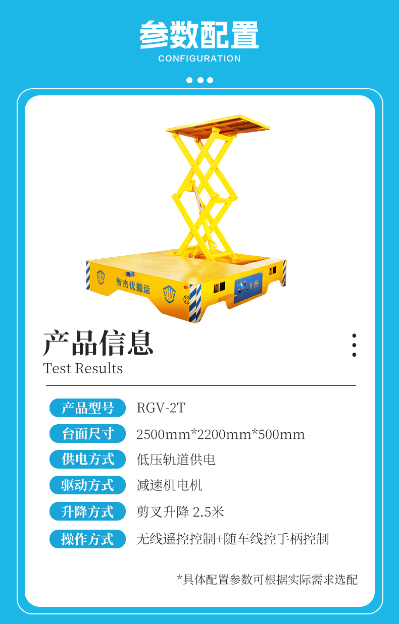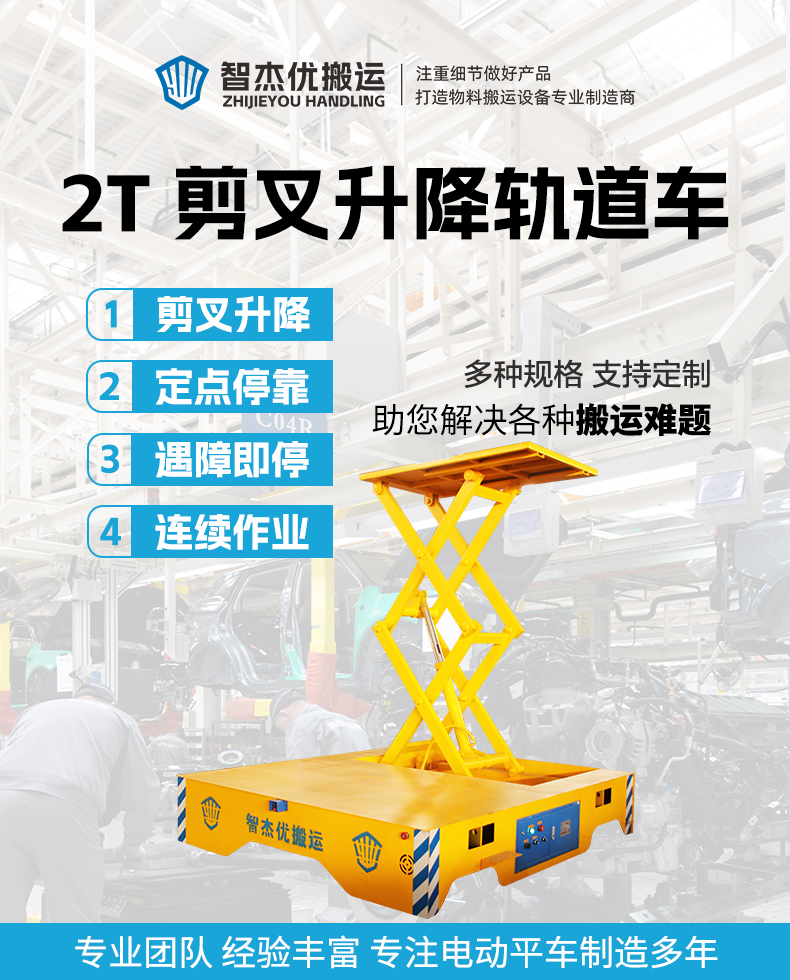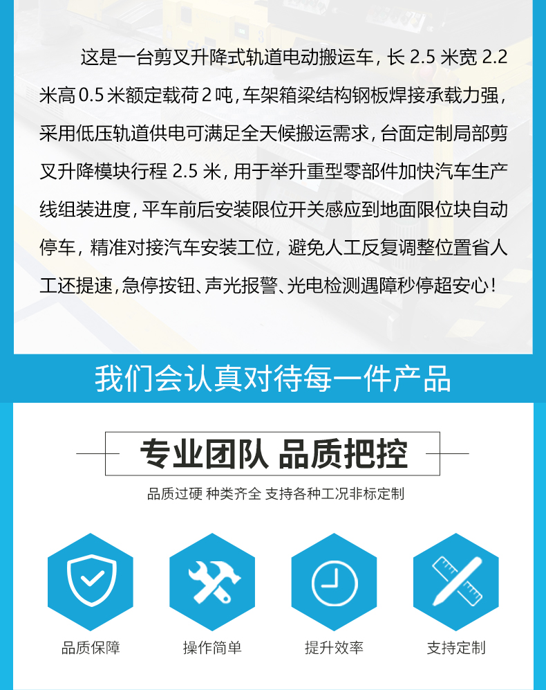 描   述: 剪叉升降式軌道電動搬運車,長2.5米寬2.2米高0.5米額定載荷2噸,車架箱梁結構鋼板焊接承載力強,采用低壓軌道供電可滿足全天候搬運需求,臺面定制局部剪叉升降模塊行程2.5米,用于舉升重型零部件加快汽車生產線組裝進度,平車前后安裝限位開關感應到地面限位塊自動停車,***對接汽車安裝工位,避免人工反復調整位置省人工還提速,急停按鈕、聲光報警、光電檢測遇障秒停超安心!