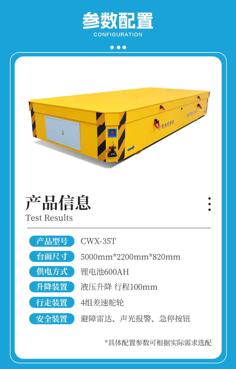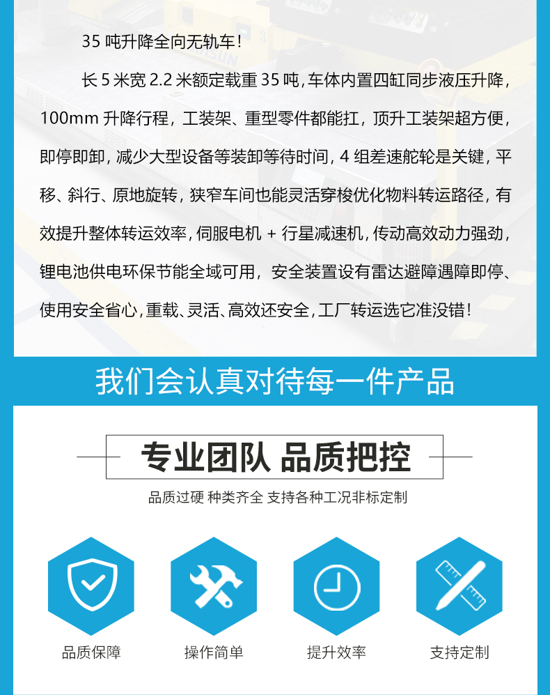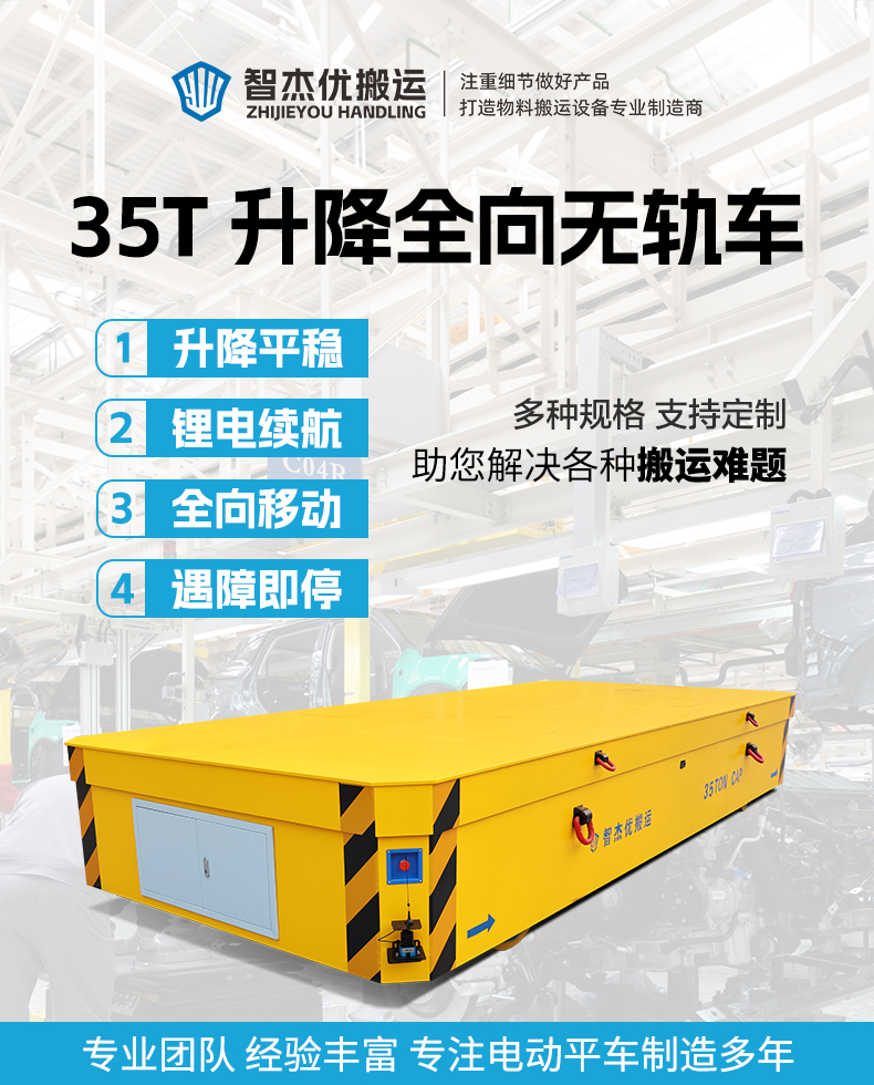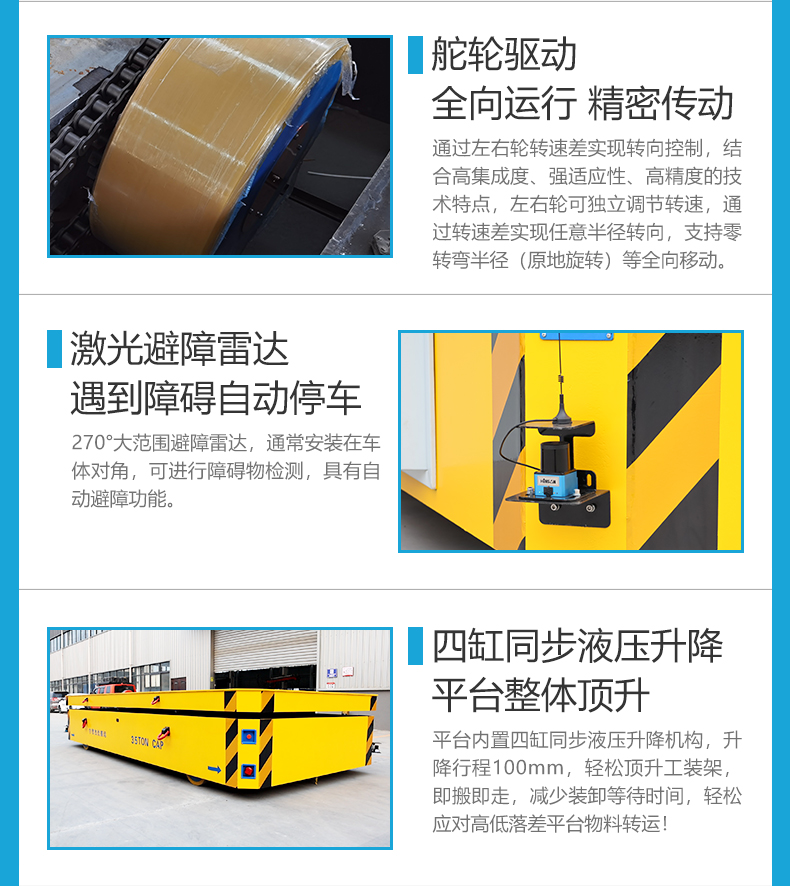 熱線:15517329551 長(zhǎng)5米寬2.2米額定載重35噸,車體內(nèi)置四缸同步液壓升降,100mm升降行程,工裝架、重型零件都能扛,頂升工裝架超方便,即停即卸,減少大型設(shè)備等裝卸等待時(shí)間,4組差速舵輪是關(guān)鍵,平移、斜行、原地旋轉(zhuǎn),狹窄車間也能靈活穿梭優(yōu)化物料轉(zhuǎn)運(yùn)路徑,有效提升整體轉(zhuǎn)運(yùn)效率,伺服電機(jī)+行星減速機(jī),傳動(dòng)高效動(dòng)力強(qiáng)勁,鋰電池供電環(huán)保節(jié)能全域可用,安全裝置設(shè)有雷達(dá)避障遇障即停、使用安全省心,重載、靈活、高效還安全,工廠轉(zhuǎn)運(yùn)選它準(zhǔn)沒(méi)錯(cuò)!